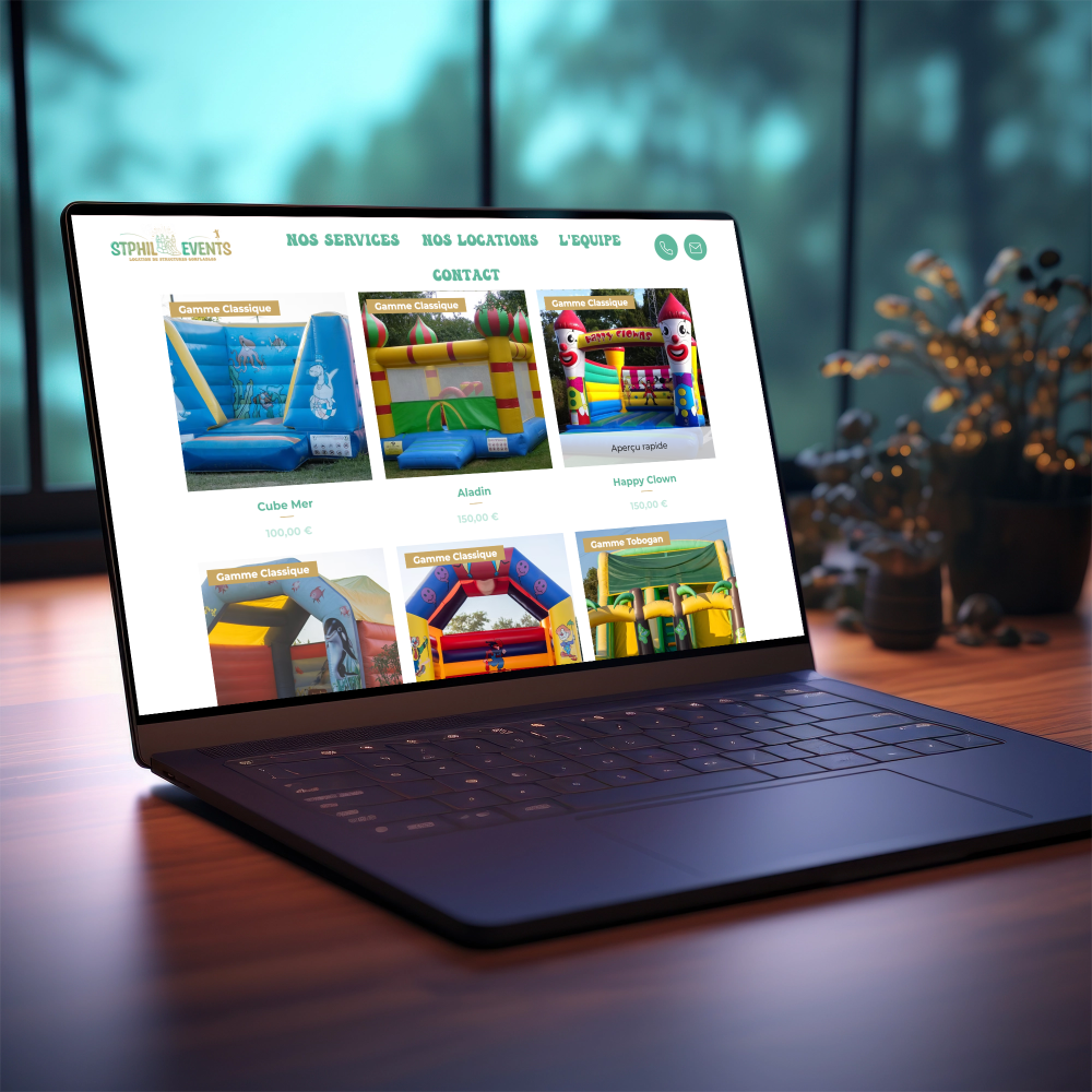 St Phil Event, c'est de la location de structure gonflable pour tout les évènements qu'ils soient professionnels ou particuliers. Une jeune entreprise qui a vu le jour en 2023 et qui a eu besoin de se faire connaitre, nous avons donc travailler à réaliser un logo, ainsi qu'un site internet.